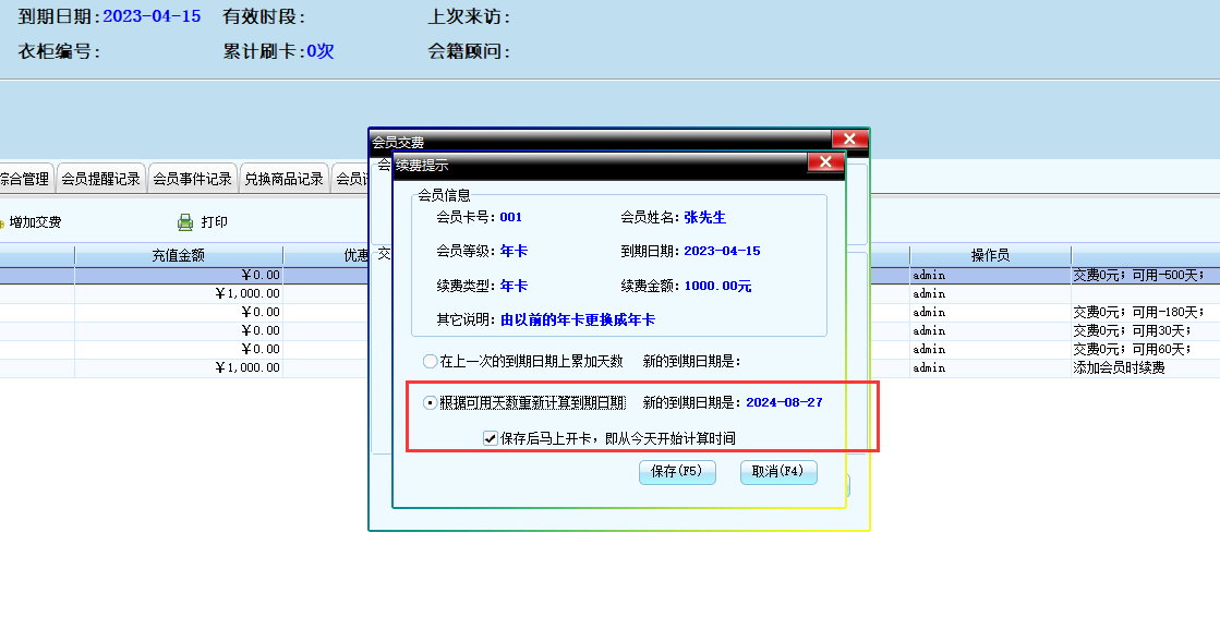 美萍健身房软件中,给会员续费充值,如何让计费时间从今天开始?而不是从会员的到期日开始?