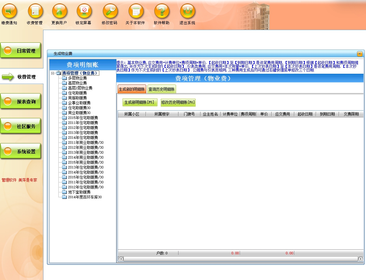 第二:物业软件费项设置:1、费项设置分为基本物业费和仪表类物业费两大类,各自又可定义多种不同的费项。基本物业费主要是定义那些按户或按房屋面积收取的费用,如:卫生费、治安费等;仪表类物业费主要是按表的走量需要计算的那些费用,如:水费、电费等,它可设置定额价和超额价。2、对于仪表类物业费又可分为自用表和公摊表两大类,并在此项设置中为每户分配仪表编号,并为住户分配要分摊的公摊表。