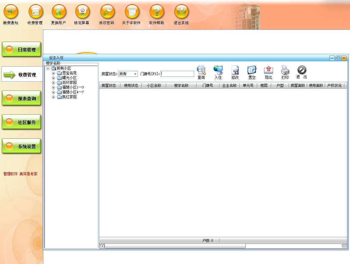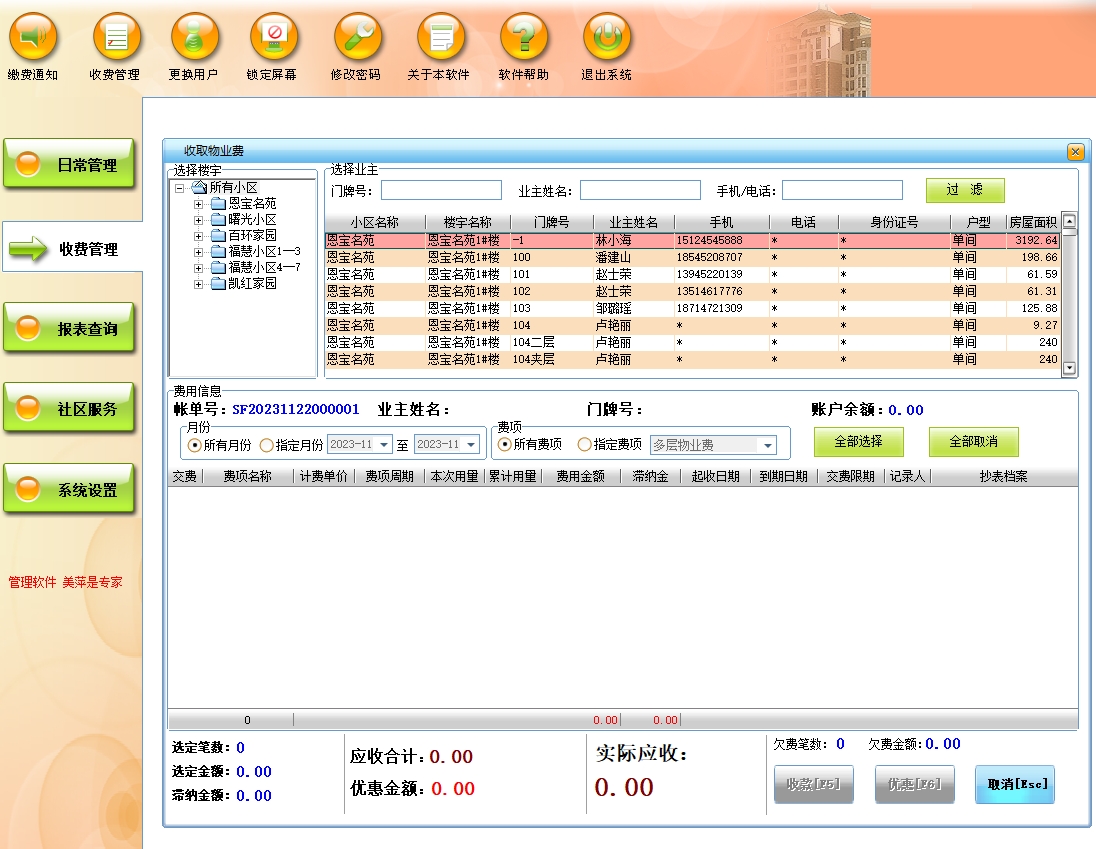 3. 业主信息管理:美萍物业收费软件可以管理业主的基本信息、房产信息,以及每个业主的缴费情况和历史记录,便于进行个性化服务和精细化管理。