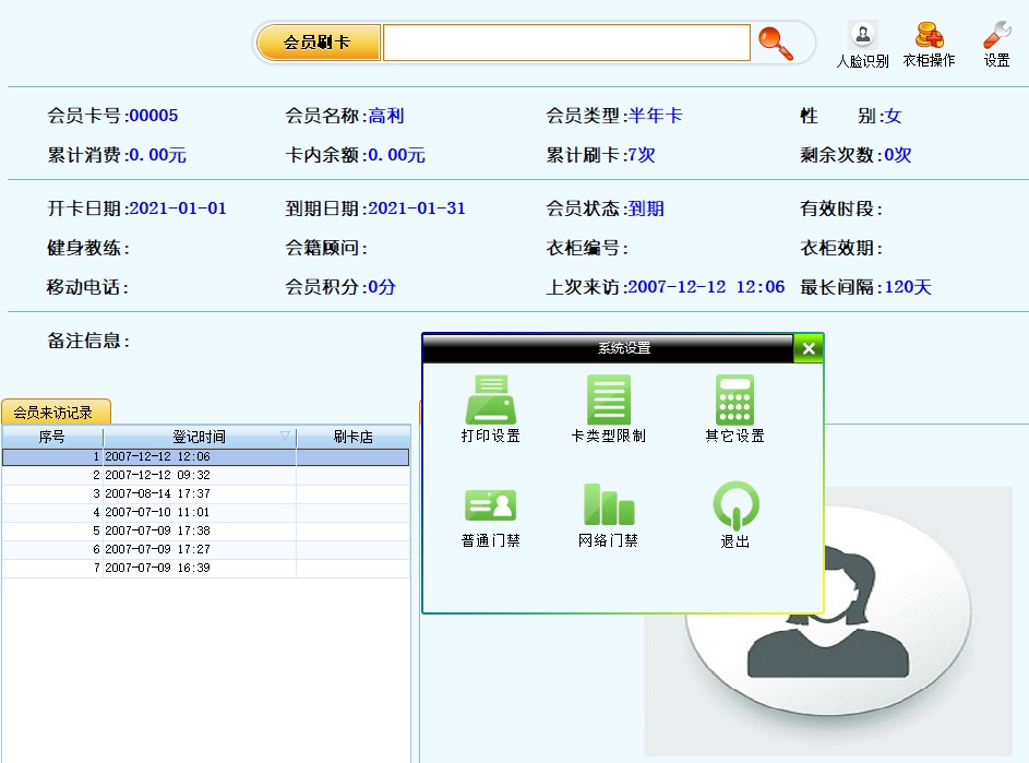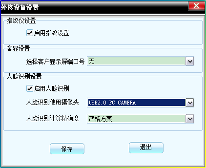 第二:健身房软件的人脸比对识别启动:在软件的系统设置里,找到外界设备设置,启用人脸识别,同时设置采集的摄像头和比较方案,添加会员时,采集会员照片,然后再主界面上,点击人脸识别就可以找到会员。