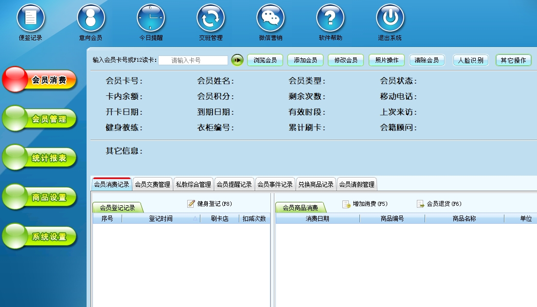 第十三:健身房软件可以对会员刷卡登记和会员消费店内商品进行管理。同时也可以管理兑换商品、充值、私教。
