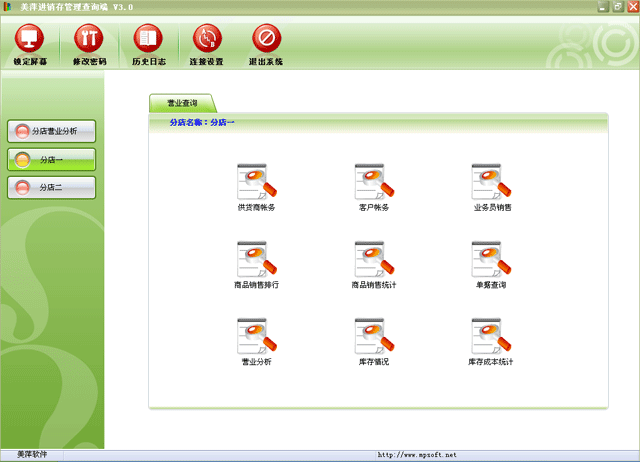 亮点2:查询某个分店的供货商帐务、客户帐务、业务员业务、商品业务排行 、商品业务统计、单据查询、营业分析、库存情况。