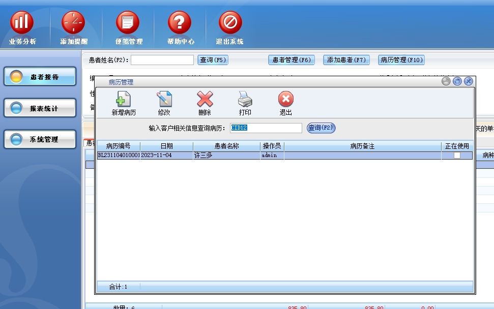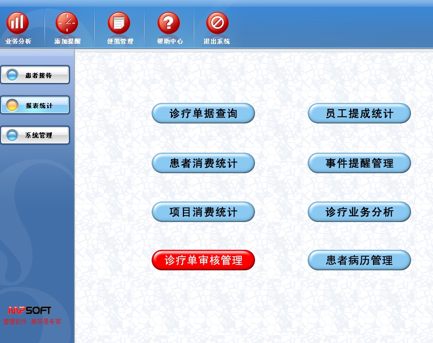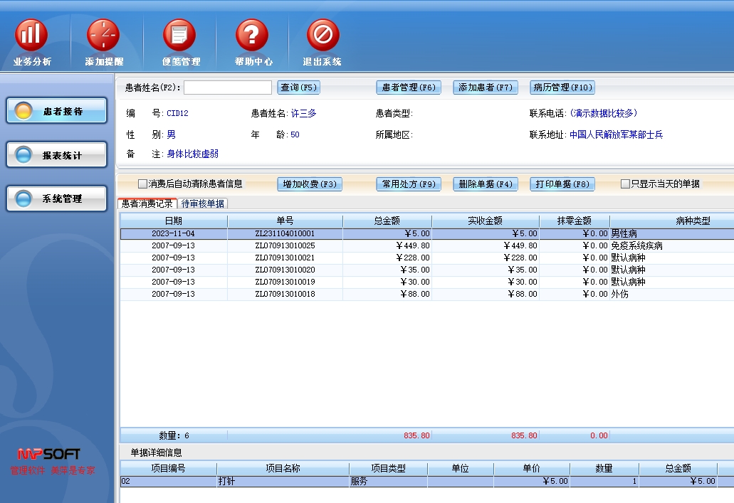 第五:诊所软件具有强大的门诊单据查询、患者消费统计、项目消费统计、员工提成统计、事件提醒管理、诊疗业务分析,随时可打印。