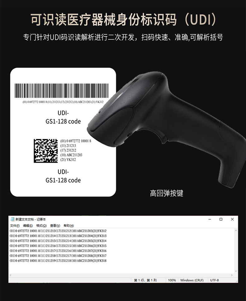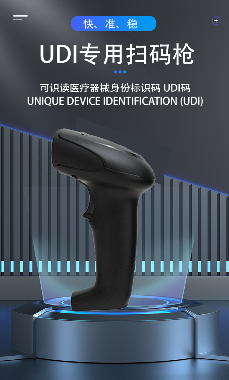 美萍医疗器械专用扫码枪是一款集条形码、二维码识别与解码于一体的扫码设备。产品专为医疗器械UDI码的高速读取与识别设计,支持各类一维码、二维码以及特殊符号的快速智能识别,可在纸质、屏幕以及各种材质表面秒速识读,精度达到99.9%以上,完美适配医疗器械行业追溯管理需求。