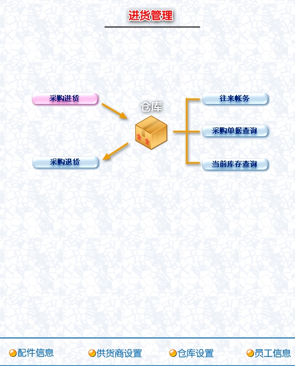 第十一:汽车维修软件(汽修软件)可以进行商品采购入库,采购退货,进/退单据和当前库存查询,与供货商的往来帐务。