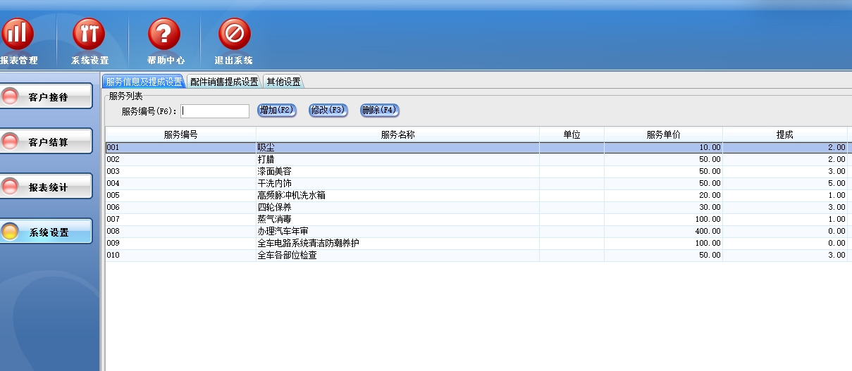 第六:汽车维修软件(汽修软件)独具特殊的客户管理,员工管理,让你管理更省心,包括服务项目的添加、提成设置,配件业务的提成设置等。