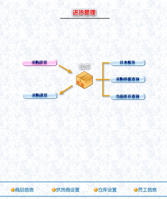 1. 商品信息管理:可以进行商品采购入库、采购退货等操作,并实时查询进/退单据和当前库存情况,同时处理与供货商的帐务往来。