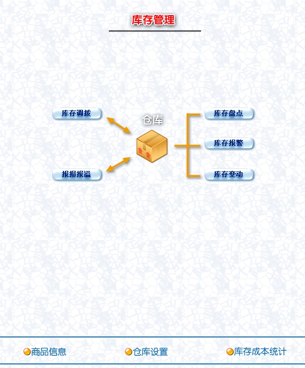 3. 库存管理:提供库存商品之间的调拔、商品的报损溢、强大的库存盘点功能以及库存商品变动查询等功能。