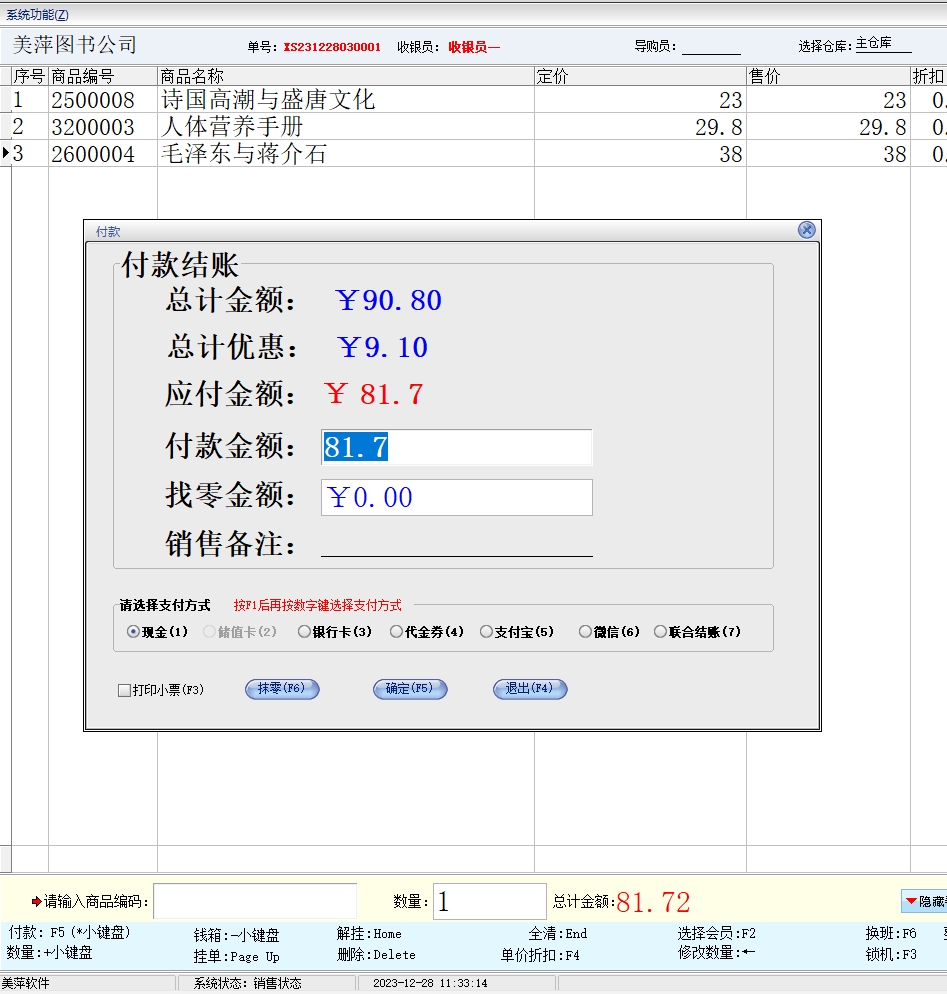 第六:图书销售软件支持多种结帐方式:现金、储值卡、代金券、信用卡、支付宝、微信、银行卡等。