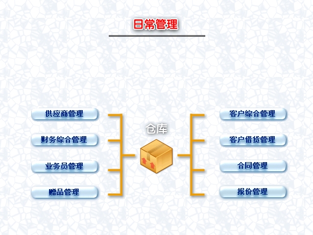 5. 日常管理:能够对供货商、客户、业务员进行综合管理,处理日常收入支出管理、客户借货坏帐管理和合同管理等任务。