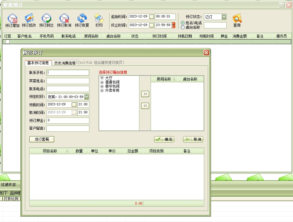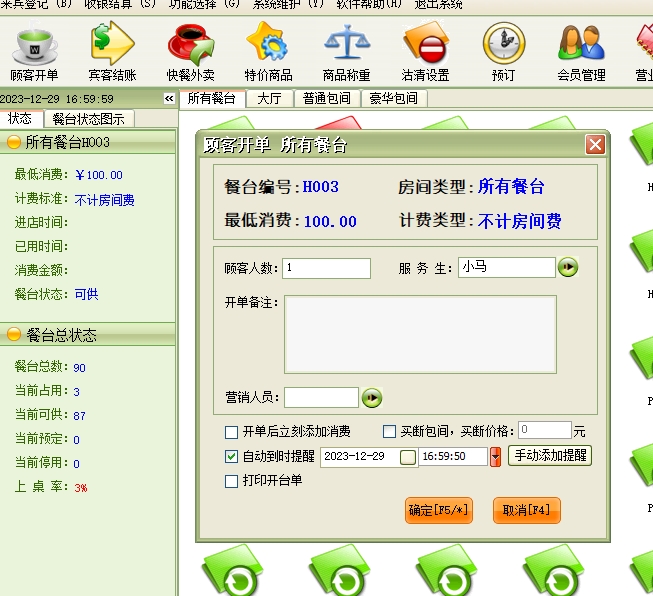 来宾登记→顾客开单:每个客户发生消费前必须进行登记(建立客户帐),给客户安排一个包厢(餐台)等包厢项目,包厢项目必须是在“系统设置”模块中的“包厢项目”中已经设置,系统只能对已设置的包厢项目(餐台)进行登记。
