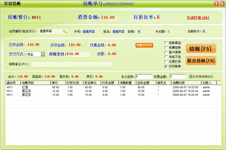 收银结账→宾客结帐:终结客户当前的消费活动,并进行收款及自动还原包厢项目(餐台)的占用状态为可供状态。