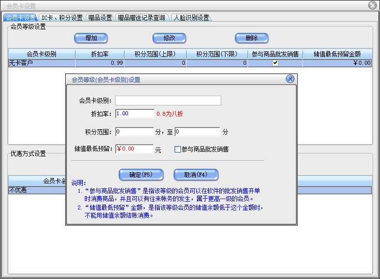 第四:化妆品销售软件支持会员管理,会员可分为折扣卡和储值卡,会员卡可以使用条码卡、磁条卡、ID卡,可以根据自己的需要设置不同的优惠方式,灵活简单。