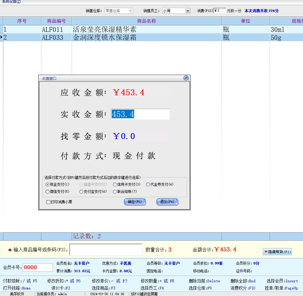 第十一:化妆品销售软件支持多种结帐方式:现金、储值卡、代金券、信用卡。