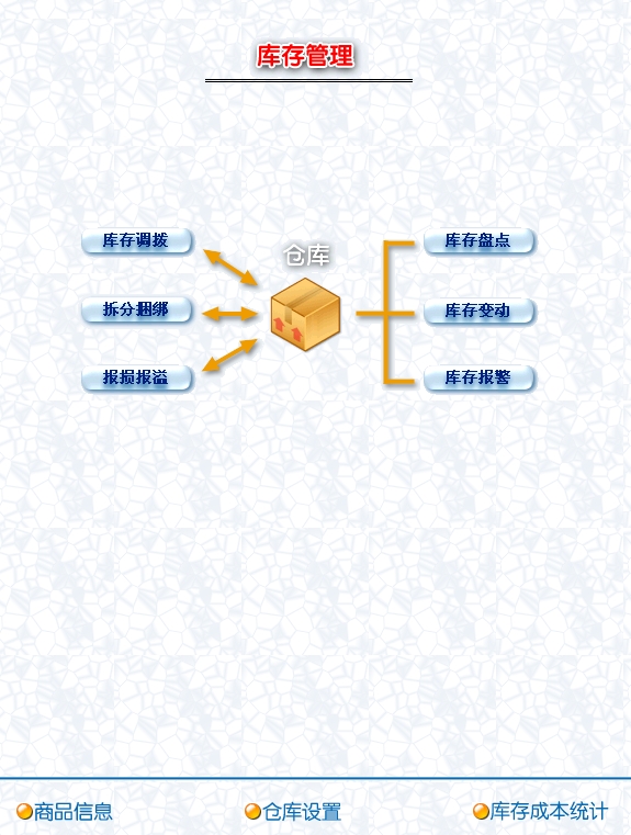 第三:化妆品销售软件提供库存之间商品调拔,商品的报损溢,强大的库存盘点功能,库存商品报警查询。