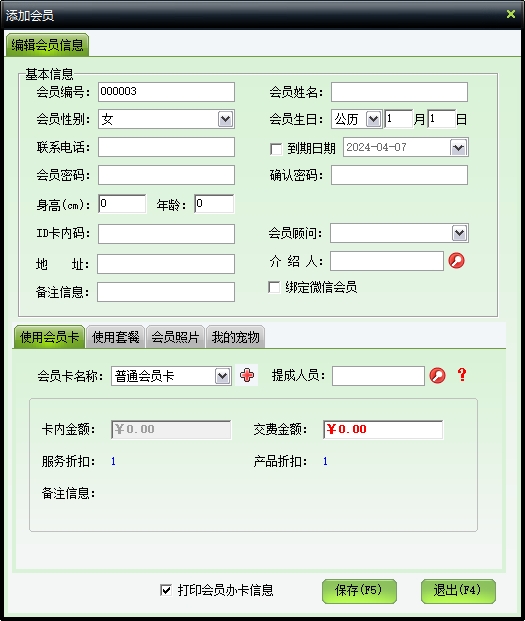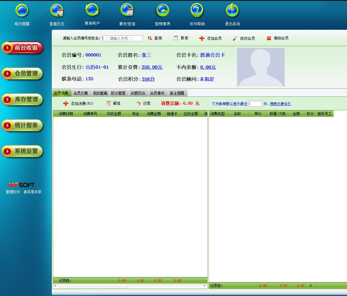 第一:宠物店软件具有强大的会员消费功能:包括护理、产品、套餐三种,均可选择服务员、床位,支持各种结账方式。