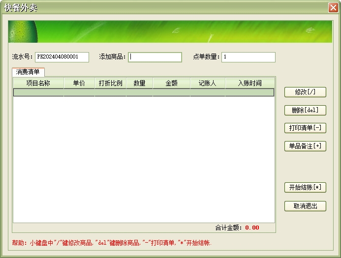 美萍快餐店管理系统类似于美萍餐饮管理系统,但快餐店管理系统最主要的不同点即特点是:快捷的点菜流程,不需开台,不受餐台状的限制,客人可直接点菜,充份体现了快餐店的方便快捷;支持快餐外卖功能,强大的外卖管理,可对外卖添加、退订、修改,可以按订餐人,送餐人、回款状态等方式查询订餐、送餐情况,外卖的消费也会统一计入汇总。