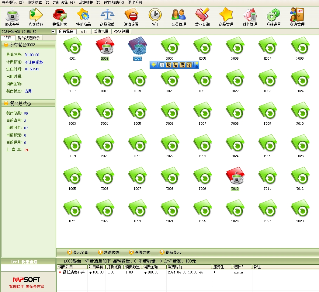 第十五:餐饮软件支持项目状态:包厢项目(餐台)的当前使用状态。例如:可供、占用、停用、预定等状态。
