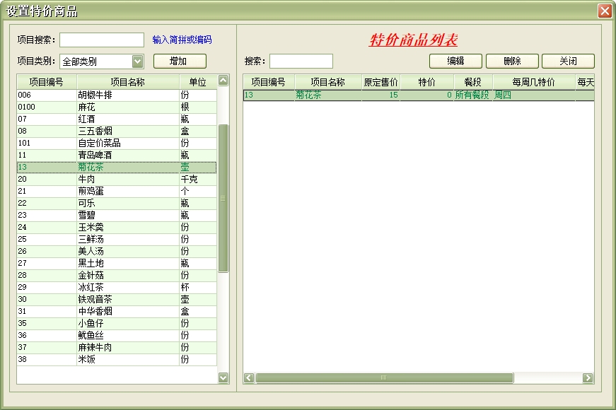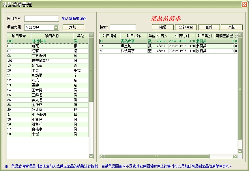 第八:餐饮软件具有商品项目管理:是店方提供给宾客的并收取一定费用的项目(例如:服务项目、酒水、香烟等)。此项目在系统设置中设置,在为宾客增加消费时使用。