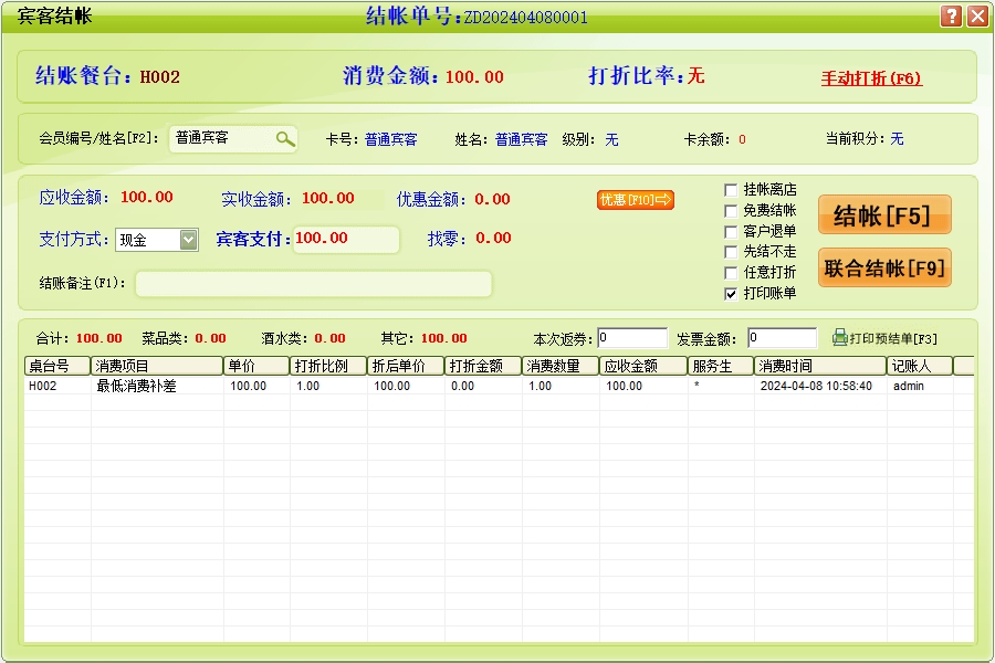 第三:餐饮软件提供收银结账管理,支持联合结账,支持多种支付以及免单和欠单。